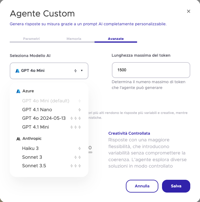 - Custom Agent: crea contenuti e risposte coerenti con il tono aziendale.