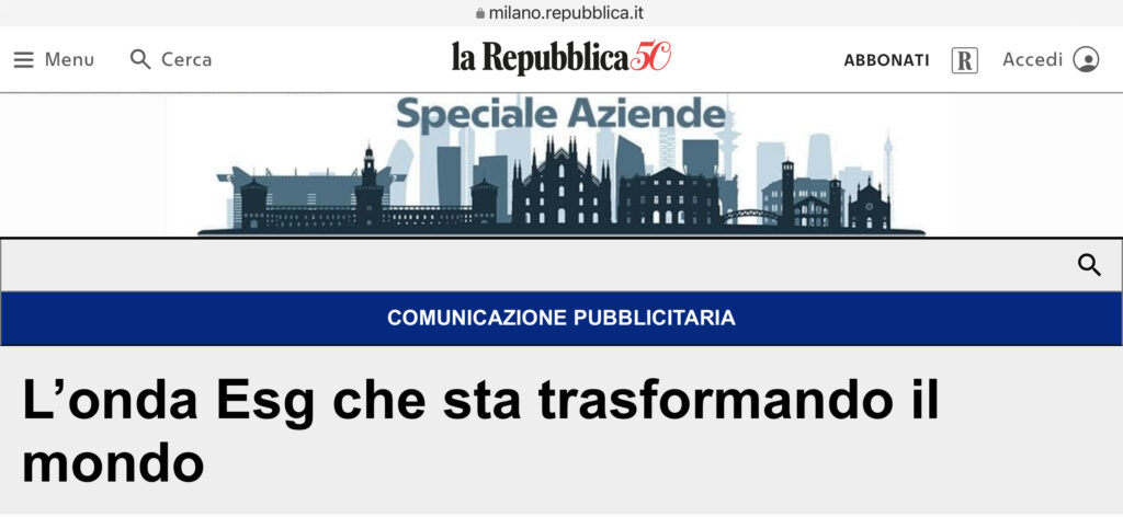 Nel dossier Eccellenze della Lombardia pubblicato da La Repubblica è uscito l’articolo “L’onda ESG che sta trasformando il mondo”. L’approfondimento si inserisce in un contesto editoriale che guarda alle trasformazioni in atto nel tessuto produttivo, concentrandosi su come il tema della sostenibilità stia incidendo in modo sempre più concreto sulle scelte delle imprese.